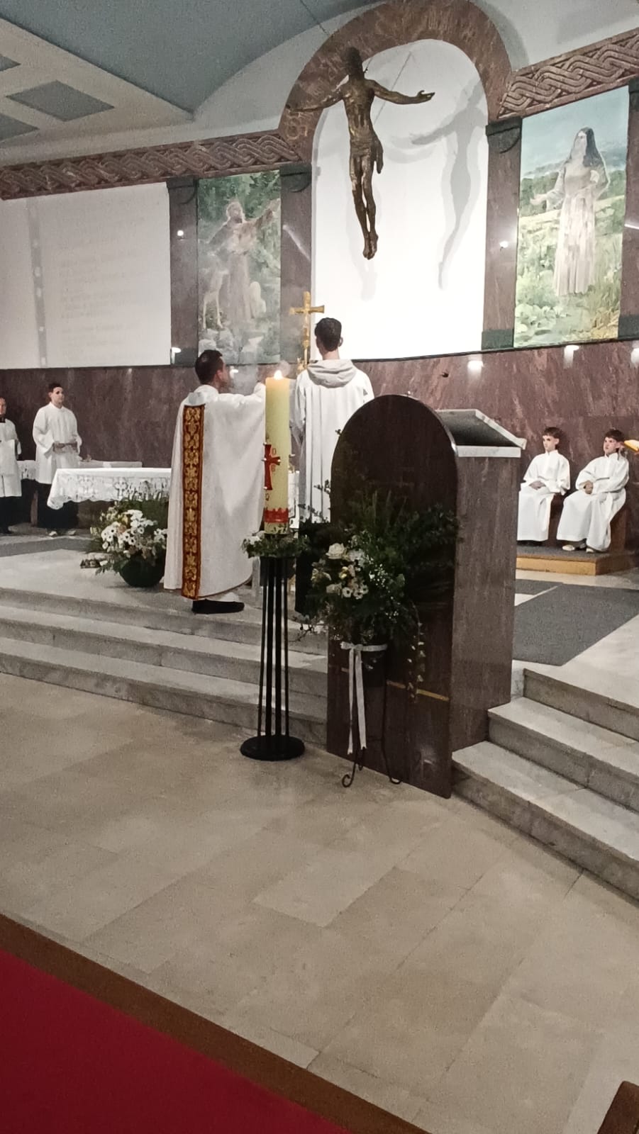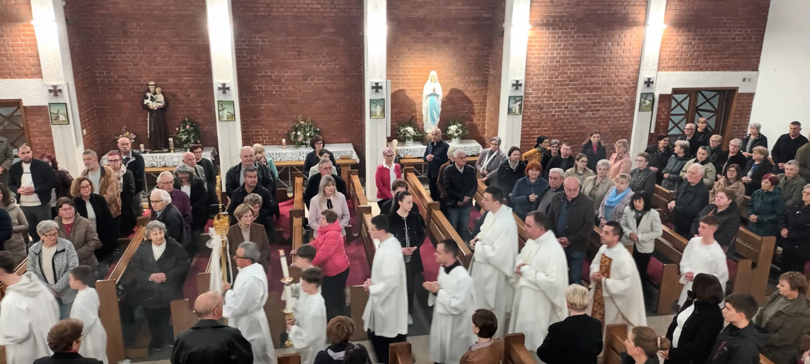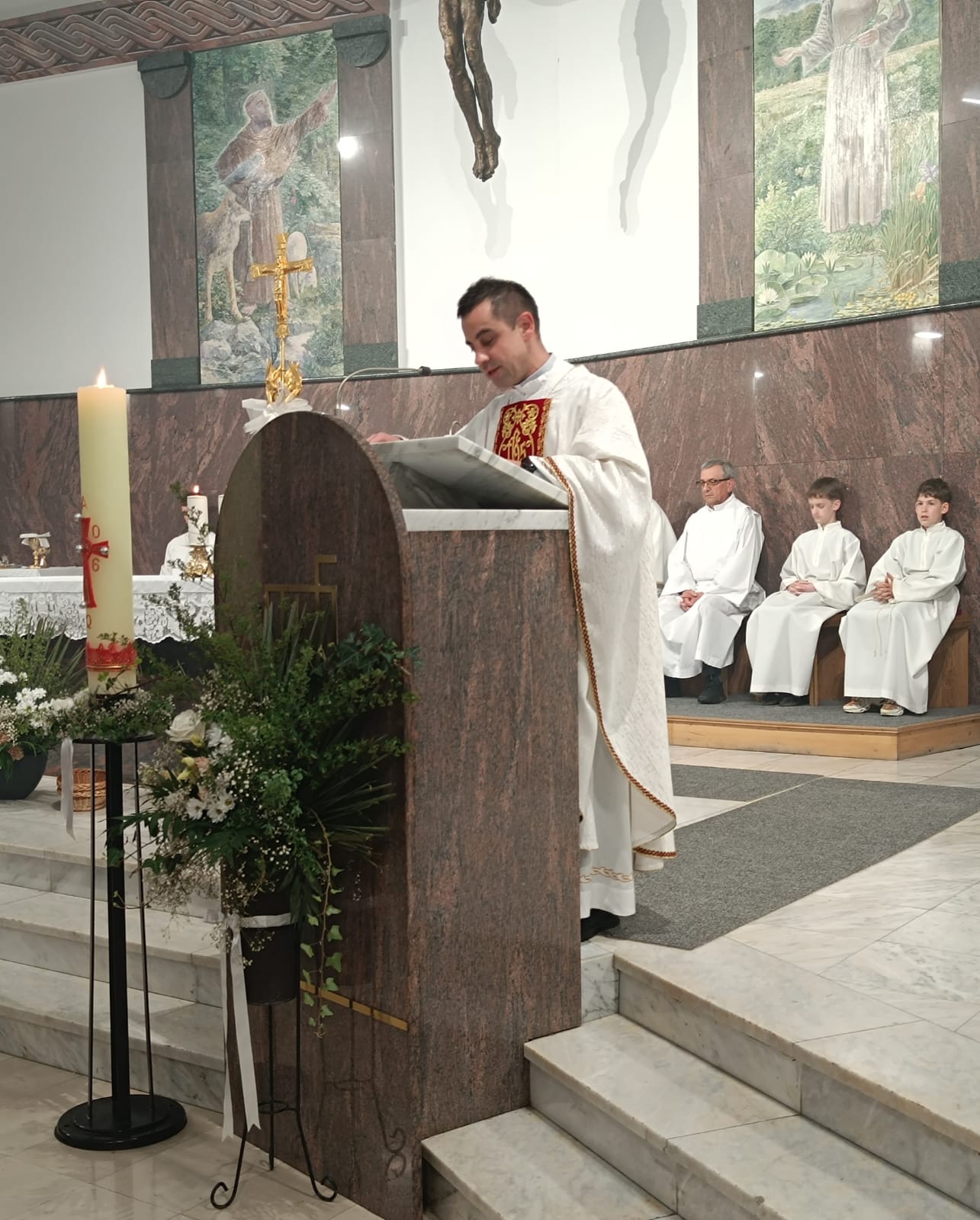 Na početku misnoga slavlja riječi dobrodošlice uputio je fra Marko rekavši da nam je »osobita radost što je ponovno s nama fra Marin Matančić, koji je u župi boravio od 2013. do 2017. godine, te nam je u tome razdoblju darovao puno lijepoga kao svećenik i redovnik.« Započinjući svoju homiliju, nakon naviještene Božje riječi, fra Marin je istaknuo da smo okupljeni u devetnici na putu prema velikome jubileju. »Šezdeset godina života. Šezdeset godina molitve. Šezdeset godina suza i radosti, križeva i uskrsnuća«, nastavio je fra Marin te dodao da Bog ljubi ovu župu i Belišće, kao i svakoga od nas – baš takve kakvi jesmo. Temelj je svega Bog koji ne ljubi jer smo dobri ili smo zaslužili njegovu ljubav – on ljubi jer je on ljubav. Rekao je dalje da nam je »lakše vjerovati u Boga koji traži, nego u Boga koji daruje. Lakše nam je vjerovati u Boga koji sudi, nego u Boga koji ljubi do kraja.« To nam potvrđuje naviješteni evanđeoski ulomak (Iv 3,16-21) u kojemu čitamo: »Ta Bog nije poslao Sina na svijet da sudi svijetu, nego da se svijet spasi po njemu.« Osvrćući se na tekst Djela apostolskih (Dj 5,17-26), fra Marin ističe da su apostoli, nakon što su ih je veliki svećenik sa svojim vijećem utamničio, ušutkani, zatvoreni i uplašeni. Bog, međutim, ima posljednju riječ: Gospodnji anđeo otvara vrata tamnice i ne samo da ih izvodi nego im govori: »Pođite i postojano u Hramu navješćujte narodu sve riječi Života ovoga.« Nije dovoljno biti oslobođen, već je potrebno i svjedočiti, nastavio je propovjednik, a to je priča i ove Župe. »Koliko je puta bilo ‘zatvorenih vrata’? Koliko je puta izgledalo da nema izlaza? Koliko je puta vjera bila na kušnji?« pitanja su koja stavljamo pred sebe. Večeras se trebamo pitati i o vlastitome svjedočenju jer »kršćanin koji šuti o Bogu polako se vraća u tamnicu.« Ova devetnica, naglasio je fra Marin, nije samo priprava za slavlje. Ona je susret sa Svjetlom koje »razotkriva, traži istinu, ne dopušta polovično.« Možda je pravo pitanje večeras gdje u mojemu životu još uvijek ima tame: »Možda u odnosima koji su ranjeni? Možda u riječima koje nismo izrekli? Možda u grijesima koje opravdavamo? Možda u vjeri koja je postala navika?« Pred nama je lik svetoga Josipa Radnika. On nije propovijedao, nije bio u središtu, ali je živio evanđelje, bio je poslušan i u srcu Božjega plana. On je čovjek Svjetla. Njegova svetost »nije bila izvanredna – bila je svakodnevna. Rad. Šutnja. Vjernost. Briga. Povjerenje.« Na ovaj se način gradila i Župa svetoga Josipa Radnika koja je, slaveći svoj jubilej, zahvalna svima onima koji su bili poput svetoga Josipa. Njihova imena možda nisu nigdje upisana, ali stoje u Božjemu srcu. Na kraju homilije fra Marin se prisjetio svoga boravka i službe u Belišću, a posebice proslave pedesete godišnjice Župe i Samostana, kada je, kako sam kaže, »tražio svoje mjesto kao svećenik.« Siguran je kako je tada bilo vjere koja je i danas nakon deset godina stvarna. I večeras, dodao je fra Marin, »Bog nije prestao djelovati. Ali još više: vi niste prestali vjerovati.« Zato ova šezdeseta obljetnica »ne smije biti samo pogled unatrag. Ono je i pitanje: što Bog sada želi od nas?« Zaključujući svoju homiliju, fra Marin je pozvao vjernike na »vjernost svoga kršćanskoga života i promjenu vlastitoga srca«, a u tome neka nas prati »tihi, snažni i vjerni sveti Josip«.