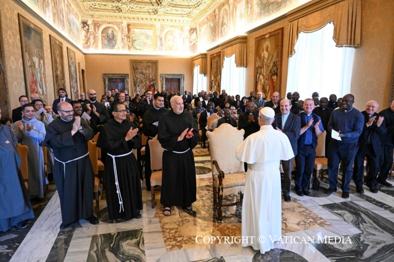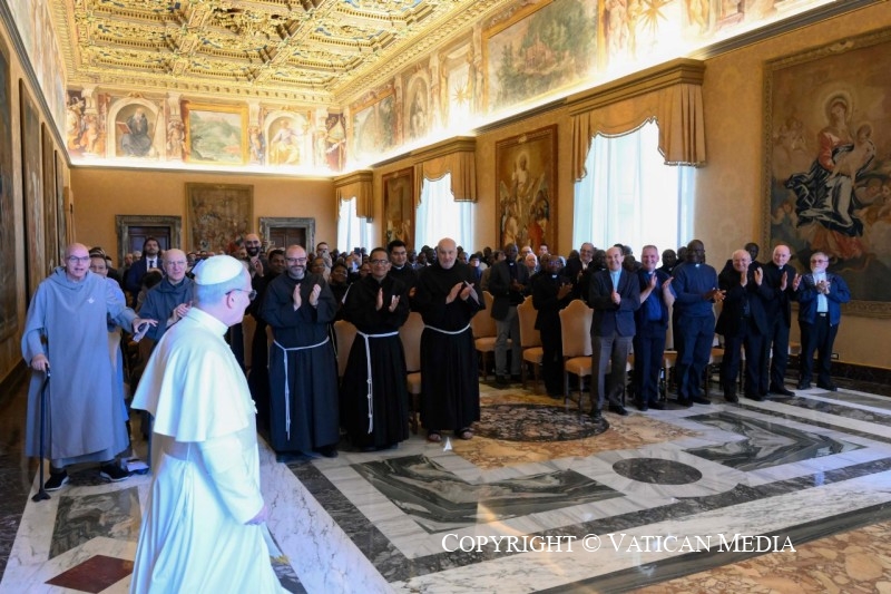 Na početku svoga govora papa je rekao: «Mnogi od vas dolaze na ovaj susret u kontekstu generalnoga kapitula, važnoga trenutka za vaš život i za život cijele Crkve. Molimo, dakle, Gospodina najprije za vaše zajednice i za sve posvećene osobe, koje ‘tražeći prije svega i samo Boga, trebaju spajati kontemplaciju – po kojoj se umom i srcem s njim sjedinjuju – s apostolskom ljubavlju koja ih potiče suradnjom se uključiti u djelo otkupljenja i širenje Božjega kraljevstva’ (v. Perfectae caritatis, 5).«